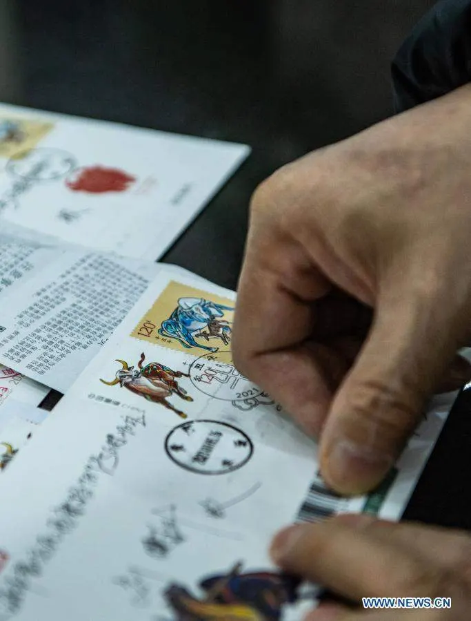 นักสะสมแสตมป์แสดงตราประทับพิเศษ ที่ออกใหม่ซึ่งมีธีมในปีฉลู ในฉางชุนมณฑล Jilin ทางตะวันออกเฉียงเหนือของจีน เมื่อวันที่ 5 มกราคม 2564 ไปรษณีย์จีนได้ออกแสตมป์พิเศษ จำนวน 2 ชุด เพื่อต้อนรับปีฉลู