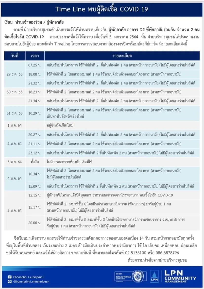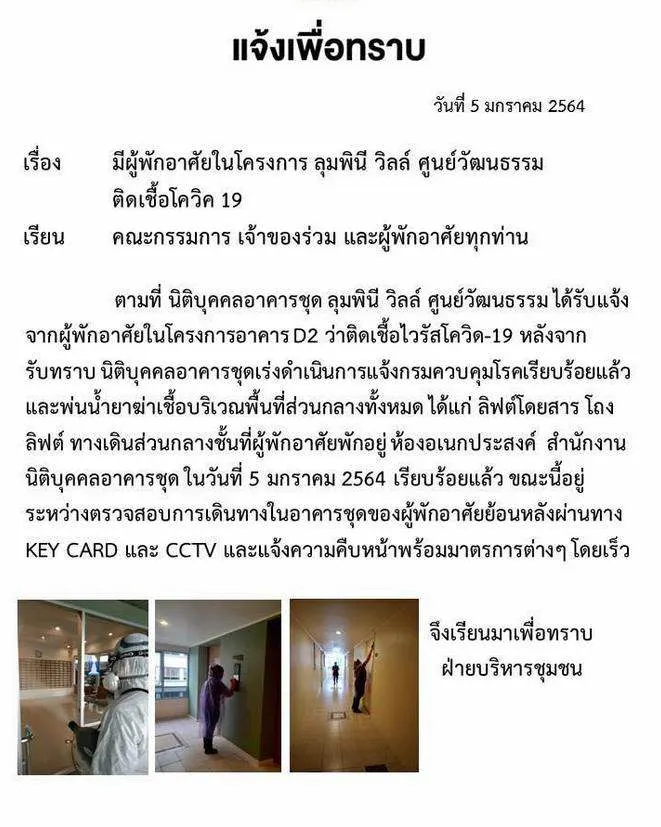 นิติบุคคล อาคารชุดลุมพินี วิลล์ ศูนย์วัฒนธรรม เปิดเผยว่า พบผู้พักอาศัยในอาคาร D2 ติดโรคระบาดโควิด-19 โดยเริ่มมีอาการเมื่อวันที่ 3 มกราคมที่ผ่านมา ด้วยอาการไข้ ต่อมาในวันนี้ 5 มกราคม เวลา 12.15 น. ผู้อยู่อาศัยดังกล่าวโทรแจ้งฝ่ายนิติบุคคลว่า ผลตรวจเลือดออกมาเป็นบวก เป็นการติดโรคระบาดโควิด-19 จากนั้นในเวลา 15.30 น. ถูกส่งตัวไปรับการรักษาที่โรงพยาบาลวิภาราม (พัฒนาการ)
