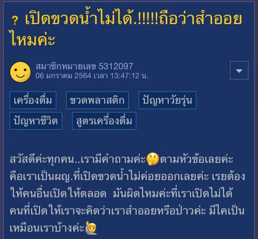 สวัสดีค่ะทุกคน..เรามีคำถามค่ะ🤔ตามหัวข้อเลยค่ะ คือเราเป็นผญ.ที่เปิดขวดน้ำไม่ค่อยออกเลยค่ะ เรยต้องให้คนอื่นเปิดให้ตลอด มันผิดไหมค่ะที่เราเปิดไม่ได้ คนที่เปิดให้เราจะคิดว่าเราสำออยหรือป่าวค่ะ มีไคเป็นเหมือนเราบ้างค่ะ🙋
