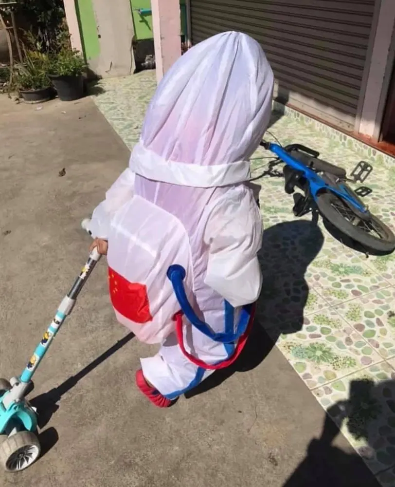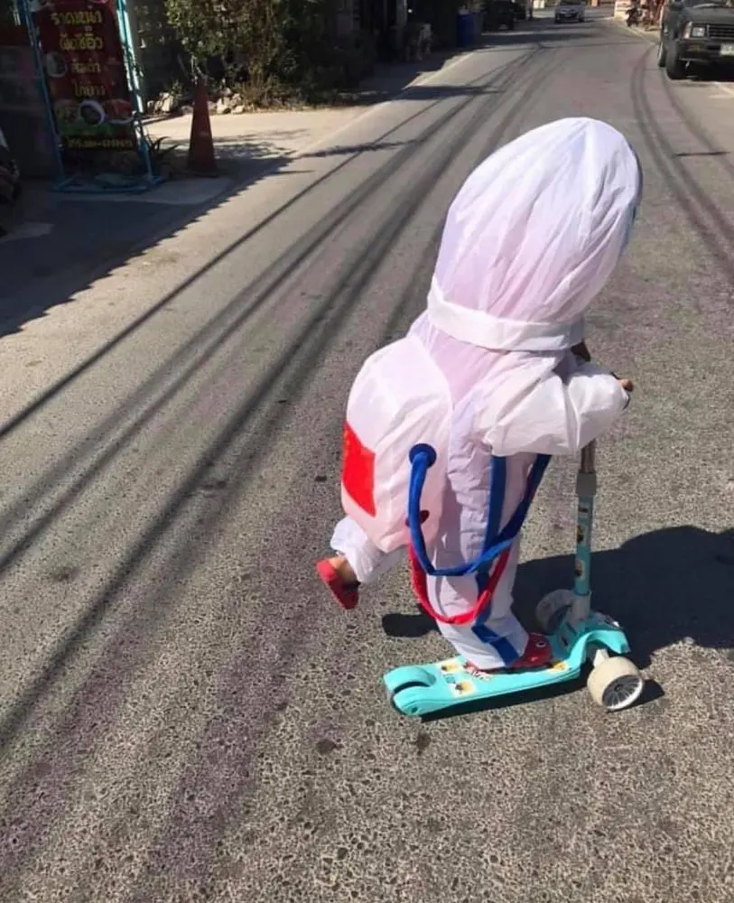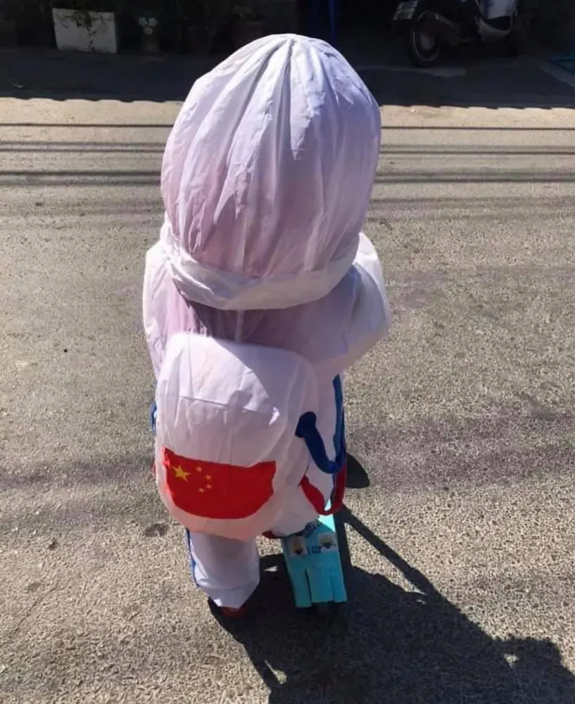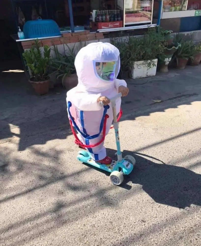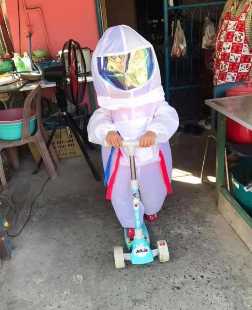 “ชุดป้องกันโควิค ตั้งแต่โควิครอบแรกยันรอบสอง น้องก็ยังใส่ได้อยู่ ทุกพื้นที่คือรันเวย์ ใส่ชุดปุ๊ปหมาเห่าปั๊ป