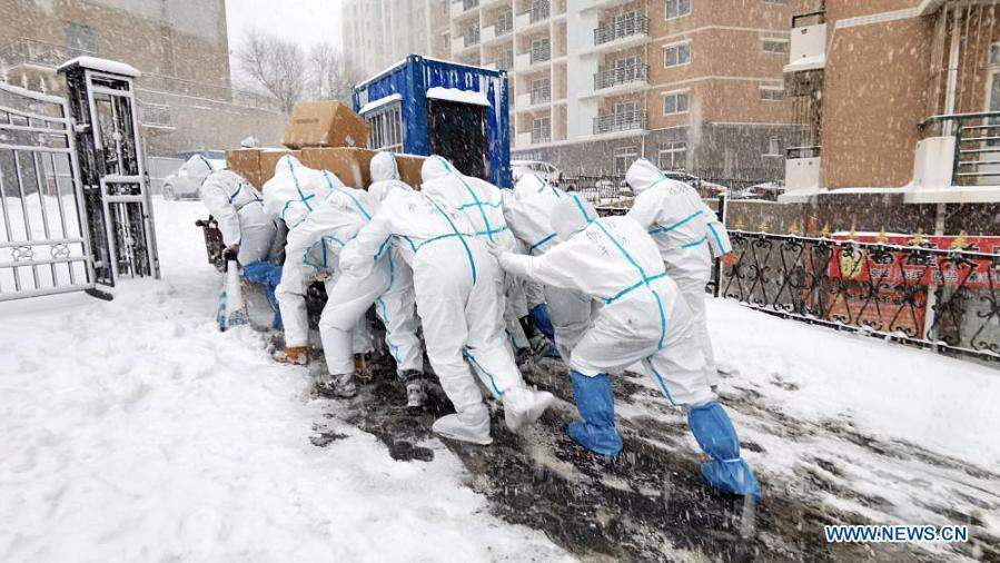 ภาพที่ไม่ระบุวันที่จัดทำโดย Dalian Ocean University แสดงให้เห็นว่า สมาชิกของทีมอาสาสมัคร ต่อต้านการแพร่ระบาดของมหาวิทยาลัย ส่งมอบสิ่งของให้กับหอพักของนักศึกษา ที่มหาวิทยาลัยใน Dalian มณฑล Liaoning ทางตะวันออกเฉียงเหนือของจีน เพื่อตอบป้องกันการแพร่ระบาด ของผู้ติดเชื้อ COVID-19