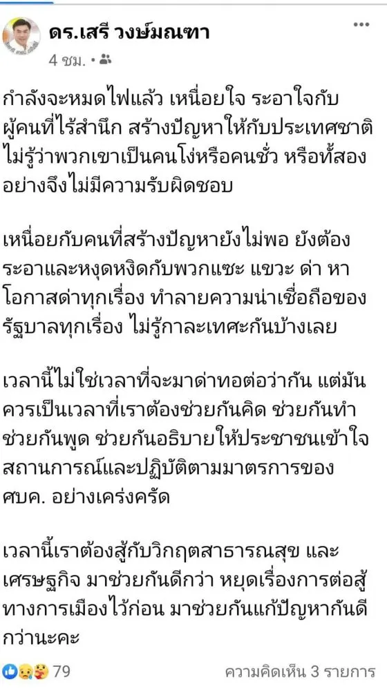หลังรู้สึกเอือมระอาที่คนไทยวันนี้ มุ่งแต่เรื่องการเมือง ด่าทอโจมตีเรื่องการเมือง บั่นทอนความตั้งใจของคนทำงาน แทนที่จะต้องช่วยกันกู้วิกฤตสาธารณสุขและเศรษฐกิจ ควรหยุดเรื่องการต่อสู้ทางการเมืองไว้ก่อน