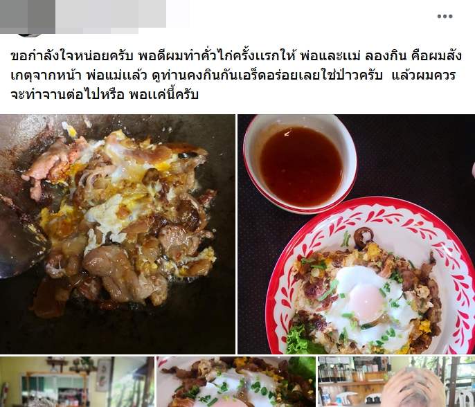 พอดีผมทำคั่วไก่ครั้งเเรกให้ พ่อและเเม่ ลองกิน คือผมสังเกตุจากหน้า พ่อแม่เเล้ว ดูท่านคงกินกันเอร็ดอร่อยเลยใช่ป่าวครับ แล้วผมควรจะทำจานต่อไปหรือ พอเเค่นี้ครับ