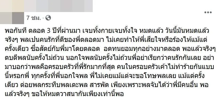พอกันที ตลอด 3 ปีที่ผ่านมา เจบทั้งกายเจบทั้งใจ หมดแล้ว วันนี้มันหมดแล้วจริงๆ พลเปนคนรักที่ดีของพี่ตลอดมา ไม่เคยทำให้พี่เสียใจหรือร้องไห้แม้แต่ครั้งเดียว ซื่อสัตย์กับพี่มาโดยตลอด อดทนยอมทุกอย่างมาตลอด พอแล้วจริงๆ ตบตีพลนับครั้งไม่ถ้วน นอกใจพลนับครั้งไม่ถ้วนพี่อย่าเรียกว่าคนรักกันเลย อย่ามาบอกว่าพลคือครอบครัวที่พี่รักมากที่สุด คนในครอบครัวเค้าไม่ทำร้ายกันแบบนี้หรอกพี่ ทุกครั้งที่พี่นอกใจพล พี่ไม่เคยแม้แต่จะขอโทษพลเลย แม้แต่ครั้งเดียว ต่อยพลกระทืบพลเตะพล สารพัด เพียงเพราะพลจับได้ว่าพี่มีคนอื่น พอแล้วจริงๆ ขอให้หมดวาสนากันเพียงเท่านี้พอ