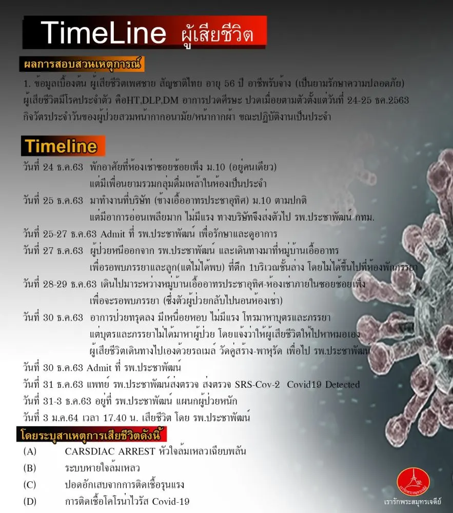 เฟซบุ๊กเพจ เรารักพระสมุทรเจดีย์ เปิดเผยไทม์ไลน์ผู้เสียชีวิตจากการติดเชื้อโควิด-19 เมื่อวันที่ 3 ม.ค. 64 ที่ผ่านมา เป็นชายไทย อายุ 56 ปี อาชีพรับจ้าง (พนักงานรักษาความปลอดภัย) โดยมีโรคประจำตัว ความดันโลหิตสูง ไขมันในเลือดสูง เบาหวาน และมีอาการปวดศีรษะ ปวดเมื่อยตามตัว ตั้งแต่วันที่ 24-25 ธ.ค. 63 กิจวัตรประจำวันผู้ป่วยสวมหน้ากากอนามัย/หน้ากากผ้าขณะปฏิบัติงานเป็นประจำ