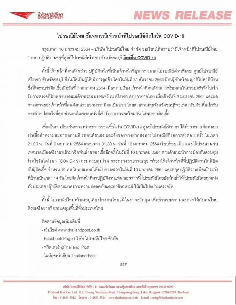 จนท.ไปรษณีย์ไทย ติดไวรัส COVID-19