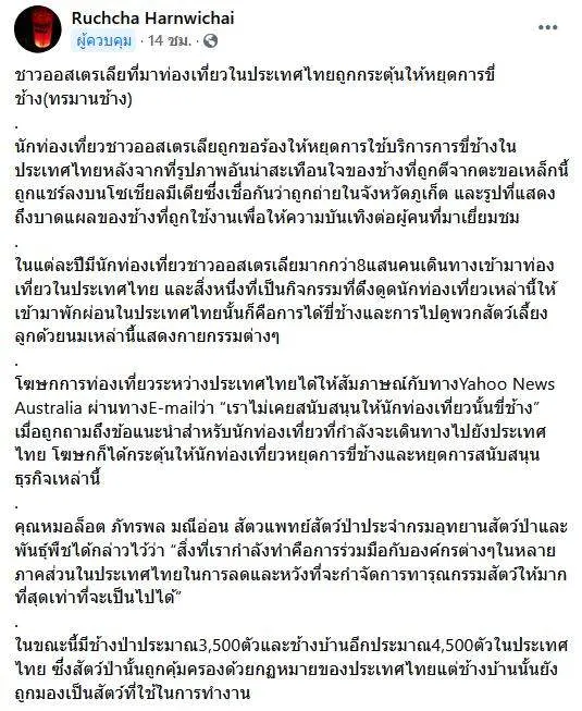นักท่องเที่ยวชาวออสเตรเลียถูกขอร้องให้หยุดการใช้บริการการขี่ช้างในประเทศไทยหลังจากที่รูปภาพอันน่าสะเทือนใจของช้างที่ถูกตีจากตะขอเหล็กนี้ ถูกแชร์ลงบนโซเชียลมีเดียซึ่งเชื่อกันว่าถูกถ่ายในจังหวัดภูเก็ต และรูปที่แสดงถึงบาดแผลของช้างที่ถูกใช้งานเพื่อให้ความบันเทิงต่อผู้คนที่มาเยี่ยมชม