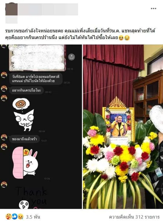 คุณแม่เพิ่งเสียเมื่อวันที่9ม.ค. แชทสุดท้ายที่ได้คุยคืออยากกินเครปร้านนึง แต่ยังไม่ได้ทันได้ไปซื้อให้เลย