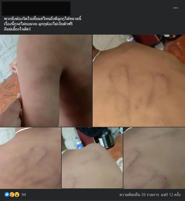 ขณะนี้สังคมออนไลน์ของสังคมลำปาง ได้มีการแชร์โพสต์ของผู้ใช้เฟซบุ๊กชื่อ “พี่นุ่นคลเดิม” ที่เขียนข้อความว่า “พวกมึงต้องจิตใจเ...้..แค่ไหนถึงตีลูกกูได้ขนาดนี้ เรื่องนี้กูจะไม่ยอมจบ ลูกกูต้องไม่เจ็บตัวฟรีอีแม่เลี้ยงใจสัตว์” พร้อมกับลงรูปของลูกชายที่มีแผลรอยเขียวช้ำบริเวณหลังจำนวนมาก เอกสารการแจ้งความ พร้อมใบรับรองแพทย์โรงพยาบาลลำปาง ที่ระบุว่าบาดแผลตามร่างกายถูกของชนิดหนึ่งที่ไม่มีคมกระทบ