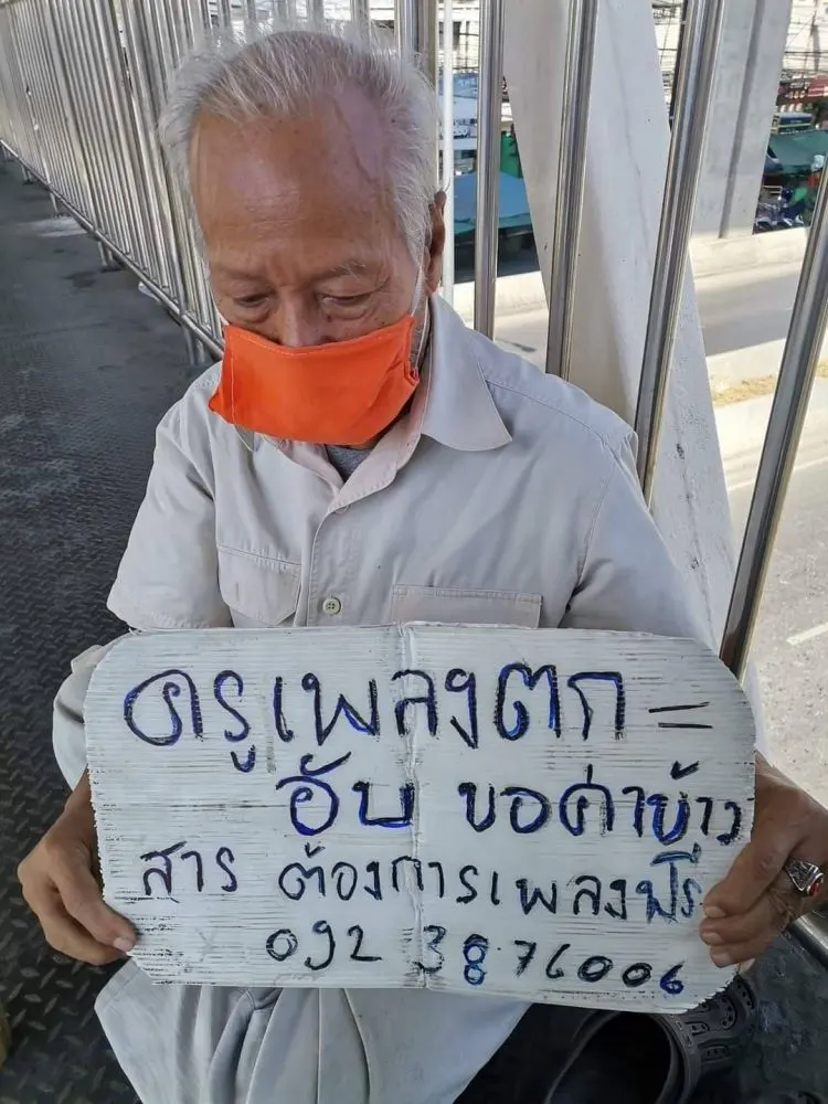 วันนี้เดินข้ามสะพานลอยตรงหน้าวัดดอนเมือง เจอคุณลุงท่านนี้นั่งอยู่เราก็เลยให้เงินช่วยแกไปเล็กน้อย พอดีเรามีกล้วยน้ำว้าติดอยู่ในกระเป๋าเลยถามลุงว่ากินข้าวรึยังหนูมีกล้วยอยู่เอามั้ยค่ะแกก็บอกว่าเอา เราเลยให้แกเก็บไว้กินหมดเลย แกบอกกับเราว่า แกเป็นครูเพลงทำเพลงขายแล้วขายไม่ได้เลยตกอับ ถ้ามีงานให้ร้องเพลงโทรหาแกเบอร์นี้ได้เลยนะ เราเลยขอถ่ายรูปไว้ เรารีบไปทำงานเลยไม่ได้ถามแกว่าชื่ออะไร เรามีเงินติดตัวอยู่นิดหน่อยและมีกล้วยอยู่3ลูกเลยให้แกเก็บไว้กินเวลาหิว เราเลยช่วยแกเท่าที่ช่วยได้ ปกติเราเดินทางเส้นนี้เป็นประจำพึ่งเคยเจอแกครั้งแรกเหมือนกันค่ะ