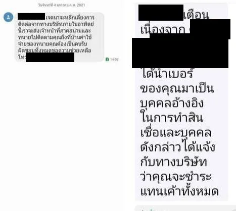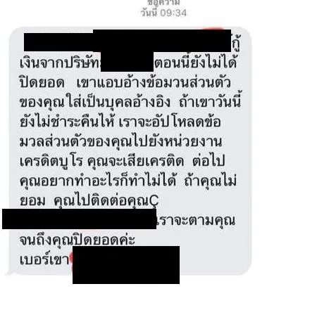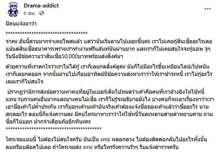 ปรากฎว่ามีการส่งข้อความหาคนที่อยู่ในเบอร์เต็มไปหมดว่าเค้าคือคนที่เราอ้างอิงให้ใช้หนี้แทน รบกวนคนอื่นมากและบางคนไม่เชื่อ เราก็ไม่รู้จะอธิบายยังไง บางคนก็จะเอาเรื่องหาว่าเราเอาชื่อเค้าไปค้ำประกัน เราก็บอกเค้านะถ้ามันจริงเค้าต้องแจ้งชื่อของเค้าแล้วว่าชื่ออะไร นามสกุลอะไร ตอนนี้ก็แจ้งความละ มีคนโทรมาหาเราว่าให้ใช้หนี้วันละหลายสายด่าหยาบคาย ถามชื่อก็ไม่บอก ฝากจ่าเตือนภัยอีกทีนะคะ