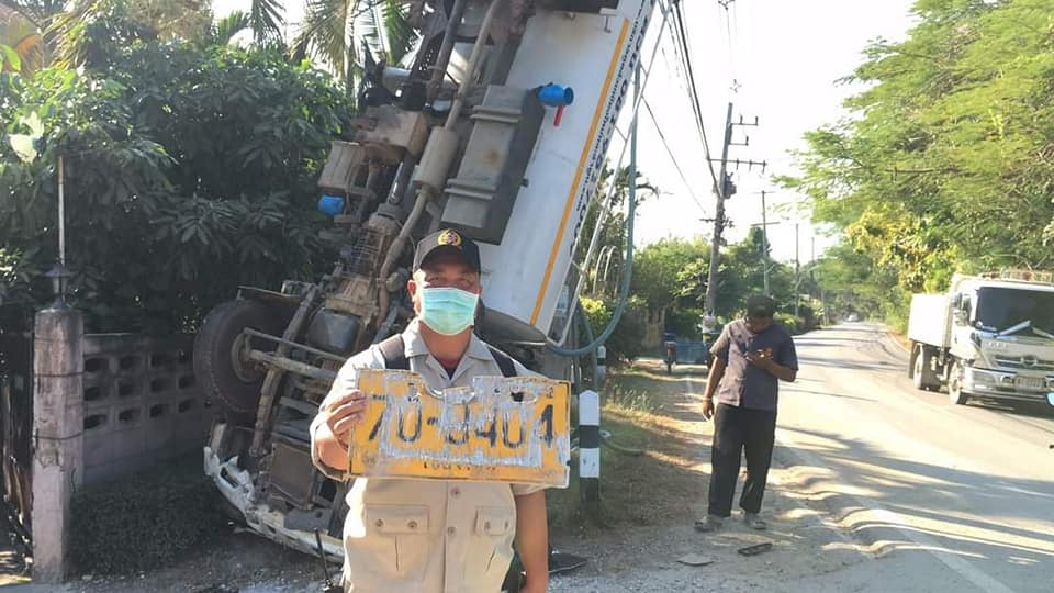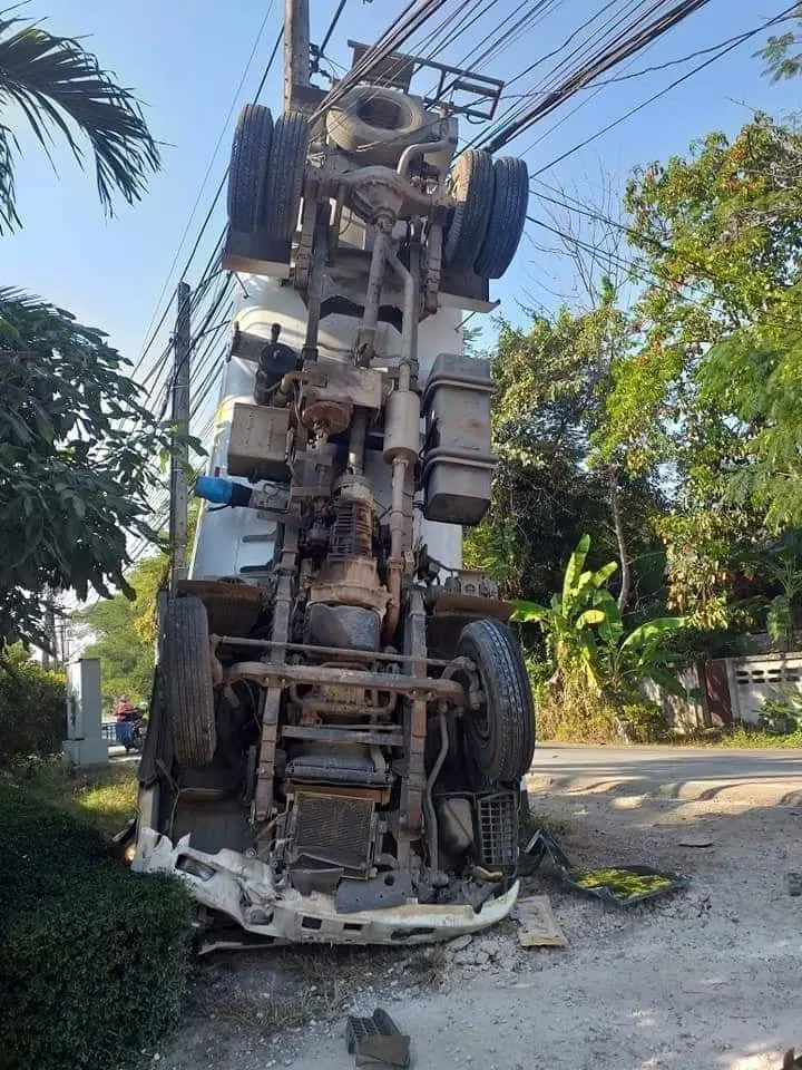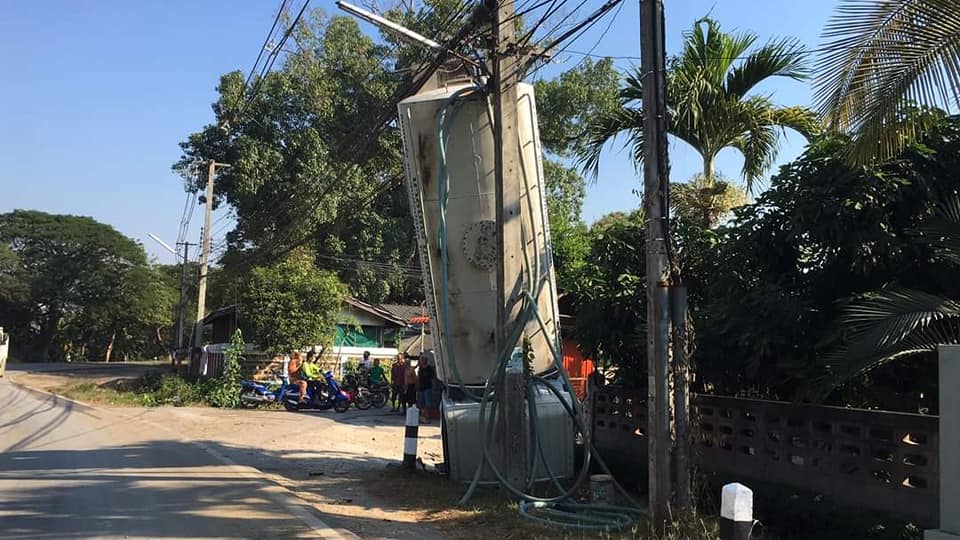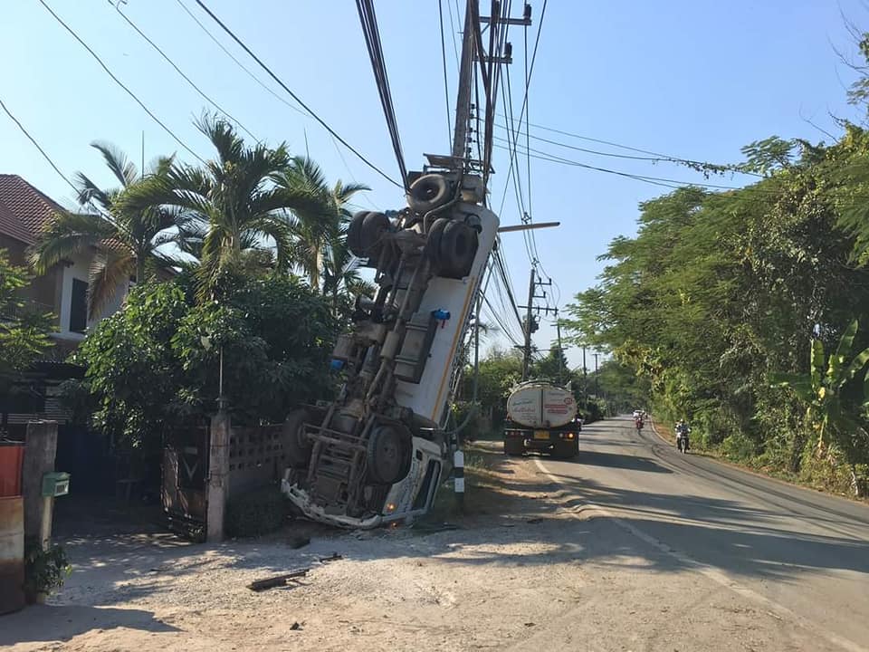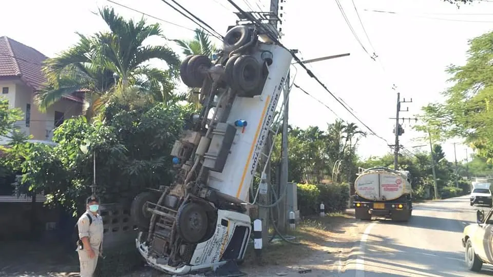 รถดูดส้วมประสบอุบัติเหตุจนท้ายรถตีลังกาพาดกับเสาไฟฟ้า