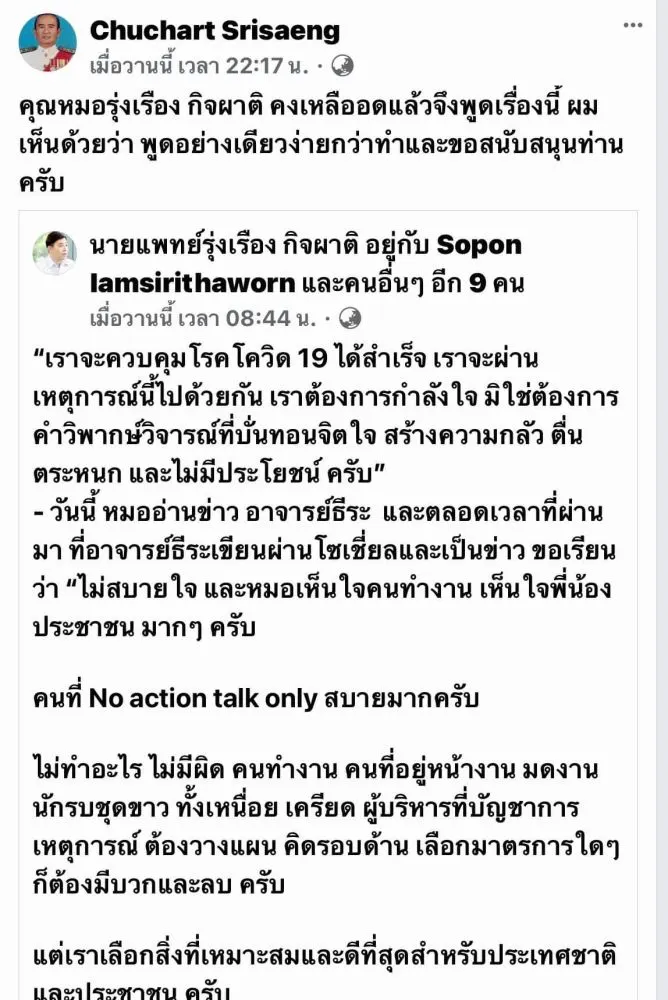 ชูชาติ ศรีแสง อดีตผู้พิพากษาศาลฎีกา โพสต์เฟซบุ๊กพร้อมแชร์ข้อความคุณหมอรุ่งเรือง กิจผาติ คงเหลืออดแล้วจึงพูดเรื่องนี้ ผมเห็นด้วยว่า พูดอย่างเดียวง่ายกว่าทำและขอสนับสนุนท่านครับ