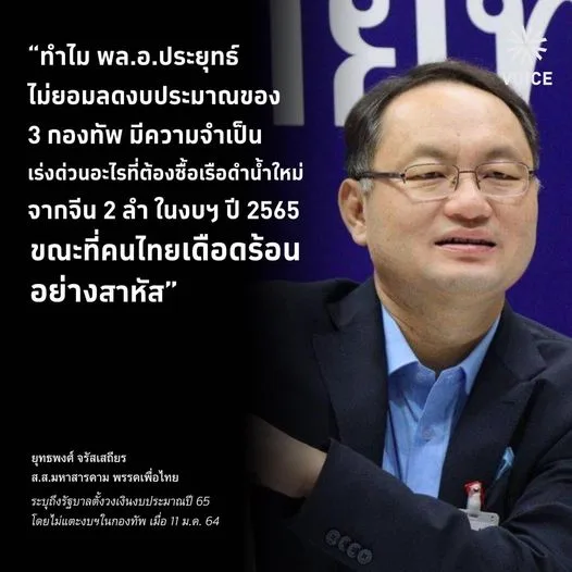 "ทำไม พล.อ.ประยุทธ์ ไม่ยอมลดงบประมาณของ 3 กองทัพ มีความจำเป็นอะไรที่ต้องซื้อเรือดำน้ำใหม่จากจีน 2 ลำ ในงบฯ ปี 2565 ขณะที่คนไทยเดือดร้อนอย่างสาหัส"