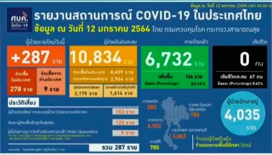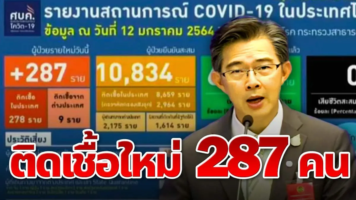 เมื่อเวลา 11.30 น. วันที่ 12 มกราคม 2564 นพ.ทวีศิลป์ วิษณุโยธิน โฆษกศูนย์บริหารสถานการณ์การแพร่ระบาดของโรคติดเชื้อไวรัสโคโรนา 2019 แถลงถึงสถานการณ์โควิด-19 ในประเทศไทย ณ โรงพยาบาลสนามจังหวัดอุบลราชธานี ว่าล่าสุด สถานการณ์การแพร่ระบาดของโรคติดเชื้อไวรัสโคโรนา 2019 (COVID-19) หรือ โควิด-19 ในไทยวันนี้ พบผู้ติดเชื้อเพิ่ม 287 ราย เป็นการติดเชื้อภายในประเทศ 278 ราย ผู้ติดเชื้อเดินทางมาจากต่างประเทศ และอยู่ในสถานที่ ที่รัฐจัดให้ 9 ราย ไม่มีผู้เสียชีวิตเพิ่ม ทำให้ยอดรวมผู้ป่วยสะสมอยู่ที่ 10,834 ราย รวมผู้ป่วยหายแล้ว 6,732 ราย รักษาอยู่ในโรงพยาบาล 4,935 ราย รวมเสียชีวิตสะสม 67 ราย