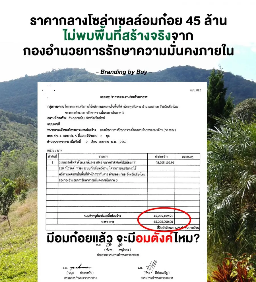 กอ.รมน.ภาค 3 ก็พัฒนาพื้นที่บนดอย!! เปิดเอกสารราคากลางจัดจ้างระบบโซลาร์เซลล์ ในพื้นที่ อ.อมก๋อย จ.เชียงใหม่ เมื่อปี 2562 มูลค่า 45 ล้านบาท อย่างไรก็ตามยังไม่พบการระบุว่าพื้นที่ก่อสร้างดังกล่าวเป็นจุดใด