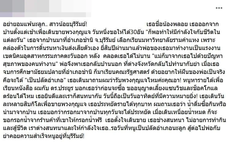 อย่ายอมแพ้นะลูก.. สาวน้อยบุรีรัมย์! เธอชื่อน้องพลอย เธอออกจากบ้านตั้งแต่เช้าเพื่อเดินขายพวงกุญแจ วันหนึ่งขอให้ได้30อัน "ก็พอทำให้มีกำลังใจกับชีวิตในแต่ละวัน" เธอจากบ้านมาที่อำเภอชำนิ จ.บุรีรัมย์ เลือกเรียนมหาวิทยาลัยรามคำแหง เพราะคล่องตัวในการดิ้นรนหาเงินส่งเสียตัวเอง ยี่สิบปีผ่านมาแล้วพ่อของเธอมาทำงานเป็นแรงงานเขตนิคมอุตสาหกรรมภาคตะวันออก หลัง คลอดเธอได้ไม่นาน "แม่ก็มาจากเธอไปด้วยปัญหาสุขภาพของคนทำงาน" พ่อจึงพาเธอกลับบ้านนอก ที่ต่างจังหวัดกลับไปทำนากับย่า เมื่อเธอจบการศึกษามัธยมปลายที่อำเภอชำนิ ก็มาเรียนคณะรัฐศาสตร์ ด้วยอยากให้ฝันของพ่อเป็นจริง คือจะได้ "เป็นปลัดอำเภอ" เธอเดินมาถามผมว่ารับพวงกุญแจไหมค่ะคุณอา! หนูหารายได้เพื่อเรียนหนังสือ ผมกับ ดร.ประยูร บอกเธอว่าก่อนจะซื้อ ขออนุญาตเลี้ยงแซนวิชและช็อคโกแลตร้อนได้ไหม เธอยินดีและเราก็สนทนากัน วันนี้ถือเป็นวันอาทิตย์ที่มีความหมายยิ่ง! เธอเดินวันละหลายสิบกิโลเพื่อขายพวงกุญแจ เธอประหยัดรายได้ทุกบาท ผมถามเธอว่า น้ำดื่มซื้อกินหรือนำมาจากบ้าน เธอบอกว่ากรอกมาจากบ้านทุกวันจะได้ประหยัด เมื่อเดินเหนื่อยน้ำหมด ก็จะขอกรอกน้ำจากร้านค้าที่เขาให้กรอกน้ำฟรี เธอตั้งใจเดินขาย เธอช่างสนทนา ไม่อายการทำกินและสู้ชีวิต เราต่างสนทนาและให้กำลังใจเธอ..รอวันที่หนูเป็นปลัดอำเภอนะลูก สู้ต่อไปพ่อกับย่าคอยความสำเร็จหนูอยู่ที่บุรีรัมย์!