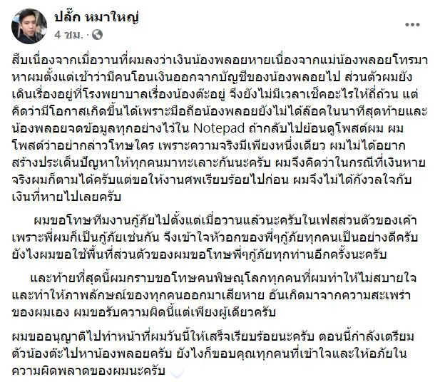 ถ้ากลับไปย้อนดูโพสต์ผม ผมโพสต์ว่าอย่ากล่าวโทษใคร เพราะความจริงมีเพียงหนึ่งเดียว ผมไม่ได้อยากสร้างประเด็นปัญหาให้ทุกคนมาทะเลาะกันนะครับ ผมจึงคิดว่าในกรณีที่เงินหายจริงผมก็ตามได้ครับแต่ขอให้งาน ศพ เรียบร้อยไปก่อน ผมจึงไม่ได้กังวลใจกับเงินที่หายไปเลยครับ