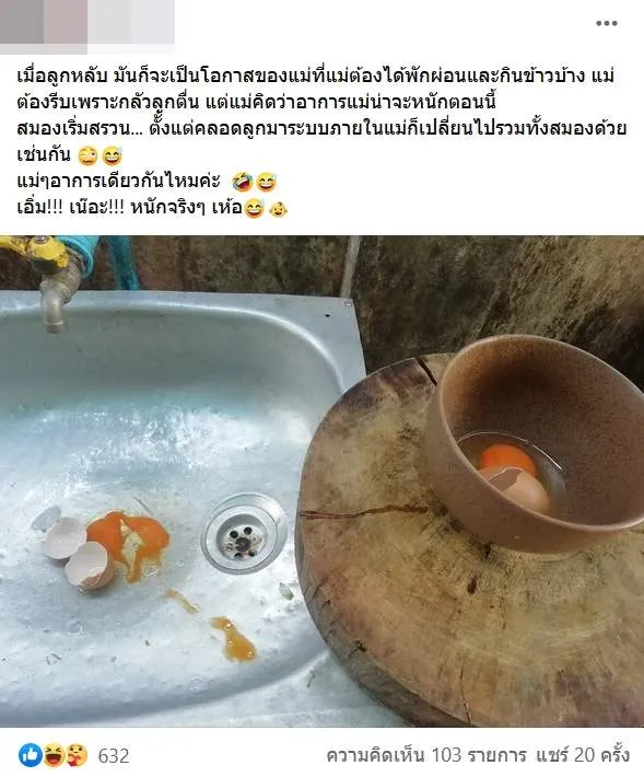 เมื่อลูกหลับ มันก็จะเป็นโอกาสของแม่ที่แม่ต้องได้พักผ่อนและกินข้าวบ้าง แม่ต้องรีบเพราะกลัวลูกตื่น แต่แม่คิดว่าอาการแม่น่าจะหนักตอนนี้
