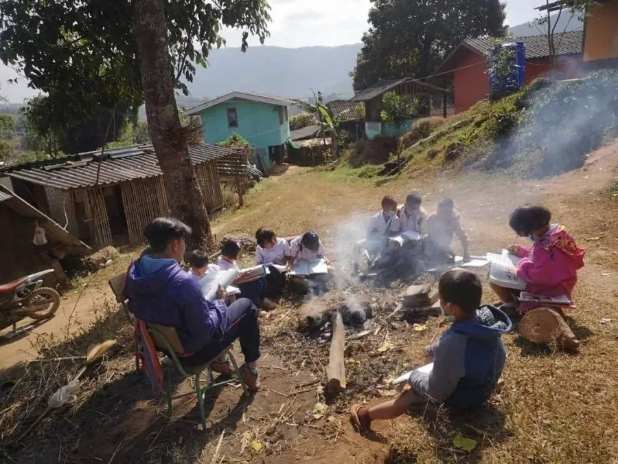ภาพบรรยากาสครูและนักเรียน อ.อมก๋อย เรียนหนังสือนอกห้อง คลายหนาว