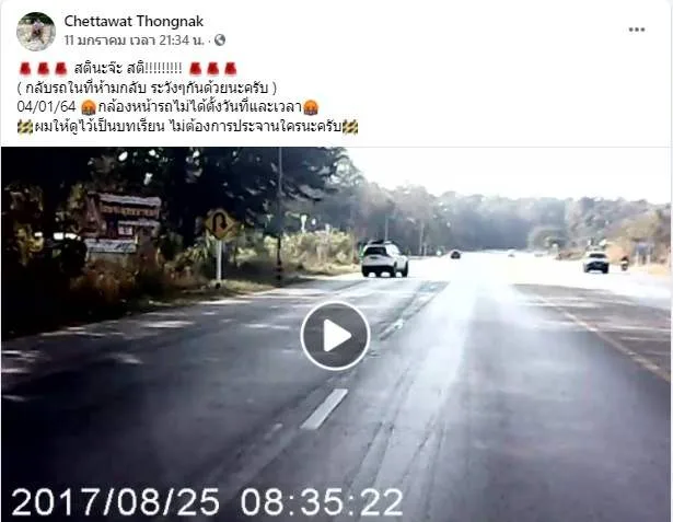 เปิดคลิประทึก จากผู้ใช้เฟซบุ๊ก Chettawat Thongnak นาทีชีวิต เหตุจากความมักง่ายและประมาทของผู้อื่น ขณะที่เจ้าของคลิปขับรถไปตามถนนปกติ อยู่ ๆ รถยนต์ปาเจโร่ที่อยู่เลนซ้ายก็เลี้ยวตัดหน้ากะทันหัน ทั้ง ๆ ที่เป็นเขตเส้นทึบห้ามเลี้ยวห้ามแซง กลายเป็นอุบัติเหตุเฉี่ยวชน และโชคดีมาก ๆ ที่ไม่มีใครเป็นอะไร