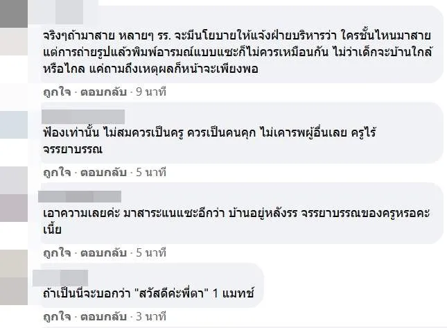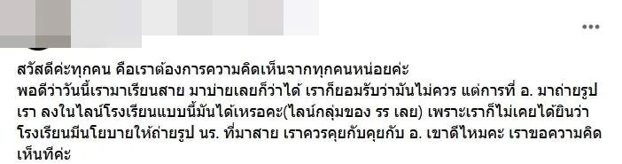 พอดีว่าวันนี้เรามาเรียนสาย มาบ่ายเลยก็ว่าได้ เราก็ยอมรับว่ามันไม่ควร แต่การที่ อ. มาถ่ายรูปเรา ลงในไลน์โรงเรียนแบบนี้มันได้เหรอคะ(ไลน์กลุ่มของ รร เลย) เพราะเราก็ไม่เคยได้ยินว่าโรงเรียนมีนโยบายให้ถ่ายรูป นร. ที่มาสาย เราควรคุยกับคุยกับ อ. เขาดีไหมคะ เราขอความคิดเห็นทีค่ะ