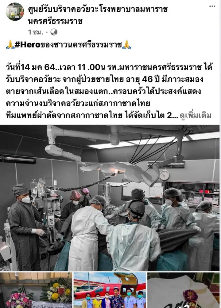 ศูนย์รับบริจาคอวัยวะโรงพยาบาลมหาราชนครศรีธรรมราช โพสต์ข้อความระบุว่า วันที่14 มค 64..เวลา 11 .00น รพ.มหาราชนครศรีธรรมราช ได้รับบริจาคอวัยวะ จากผู้ป่วยชายไทย อายุ 46 ปี มีภาวะสมองตายจากเส้นเลือดในสมองแตก..ครอบครัวได้ประสงค์แสดงความจำนงบริจาคอวัยวะแก่สภากาชาดไทย