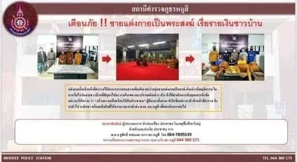 เมื่อวันที่ 13 ม.ค.64 พ.ต.อ.ชูสิทธิ์ หล่อแสง ผู้กำกับการสถานีตำรวจภูธรหมูสี นำกำลังเข้าตรวจสอบหลังได้รับเรื่องร้องเรียน ทำการจับกุม ชาย แต่งตัวเป็นพระสงฆ์ เดินริมทาง ทำทีขอรับน้ำดื่มจากนักท่องเที่ยวแล้วเรียกทรัพย์ บริเวณถนนทางขึ้นเขาใหญ่ ถนนกุดคล้า-ผ่านศึก