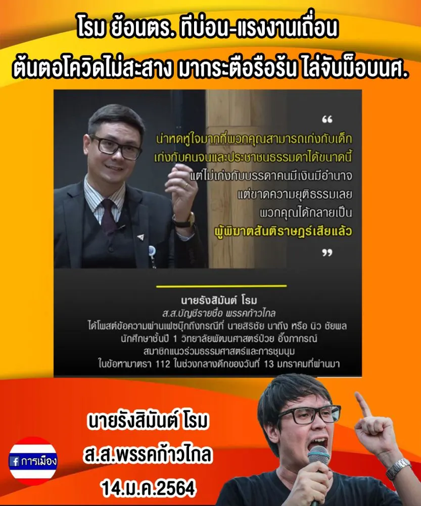 โรม ย้อนตร. ทีบ่อน-แรงงานเถื่อน ต้นตอโควิดไม่สะสาง มากระตือรือร้น ไล่จับม็อบนศ.ในสถานการณ์ที่ยากลำบากเช่นนี้ ตำรวจกลับฉวยโอกาสซ้ำเติมประชาชน ไล่จับคนแต่ผู้แสดงออกทางการเมือง… ด้วยความกระตือรือร้นอย่างถึงที่สุด