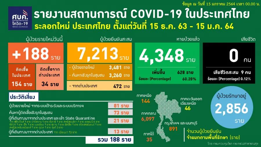 15 มกราคม : ไทยมีผู้ติดเชื้อ #โควิด19 เพิ่มขึ้น 188 ราย แบ่งเป็น..
