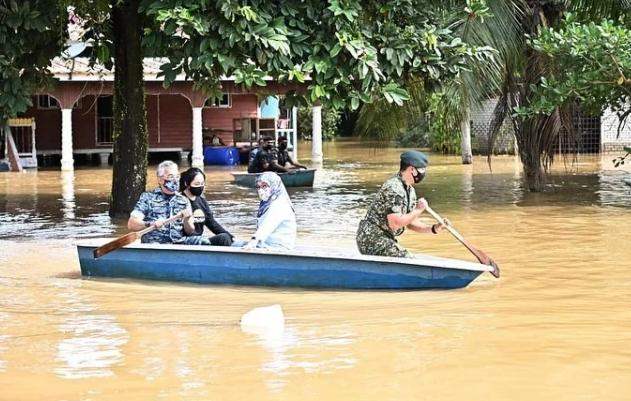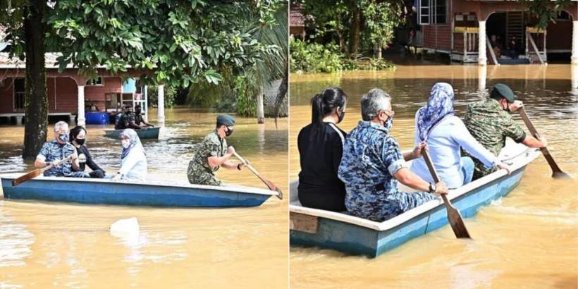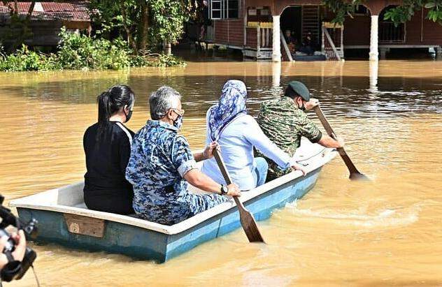 เปิดภาพ กษัตริย์มาเลย์ "พายเรือ" ฝ่าน้ำท่วม เสด็จพร้อมราชินี-โอรสธิดา เยี่ยมผู้ประสบภัย