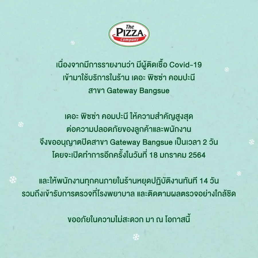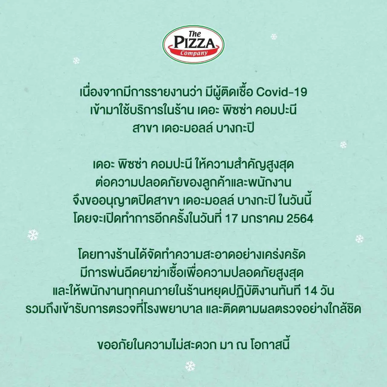 16 ม.ค.64 มีการรายงานว่า มีผู้ติดเชื้อโควิด-19 เข้ามาใช้บริการในร้าน เดอะพิซซ่า คอมปะนี สาขาเดอะมอลล์ บางกะปิ ดังนั้น เดอะ พิซซ่า คอมปะนี จึงได้ประกาศปิดสาขาเดอะมอลล์ บางกะปิ ในวันนี้ โดยจะเปิดทำการอีกครั้งในวันที่ 17 ม.ค. 64
