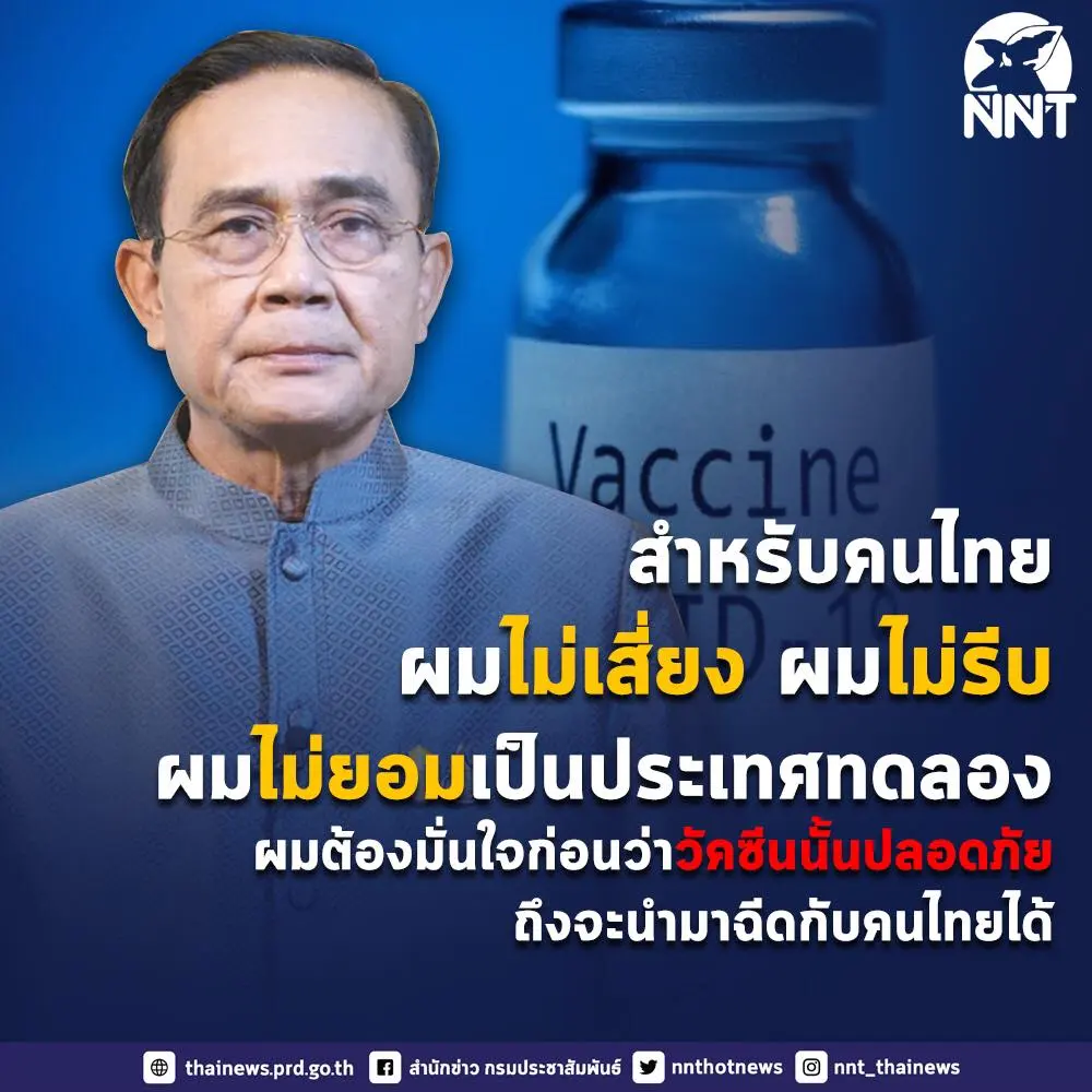 สำหรับคนไทย ผมตัดสินใจไม่รับความเสี่ยงแบบนั้น ผมไม่ยอมให้รีบร้อนฉีดวัคซีนที่ยังทดสอบไม่ครบถ้วน และไม่ยอมเป็นประเทศทดลอง ดังนั้น เพื่อความรอบคอบ ผมจึงมีนโยบายสำคัญ คือ ต้องมั่นใจก่อนว่าวัคซีนนั้นปลอดภัย จึงจะนำมาใช้กับคนไทยได้