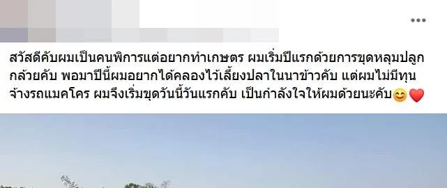 สวัสดีคับผมเป็นคนพิการแต่อยากทำเกษตร ผมเริ่มปีแรกด้วยการขุดหลุมปลูกกล้วยคับ พอมาปีนี้ผมอยากได้คลองไว้เลี้ยงปลาในนาข้าวคับ แต่ผมไม่มีทุนจ้างรถแมคโคร ผมจึงเริ่มขุดวันนี้วันแรกคับ เป็นกำลังใจให้ผมด้วยนะคับ