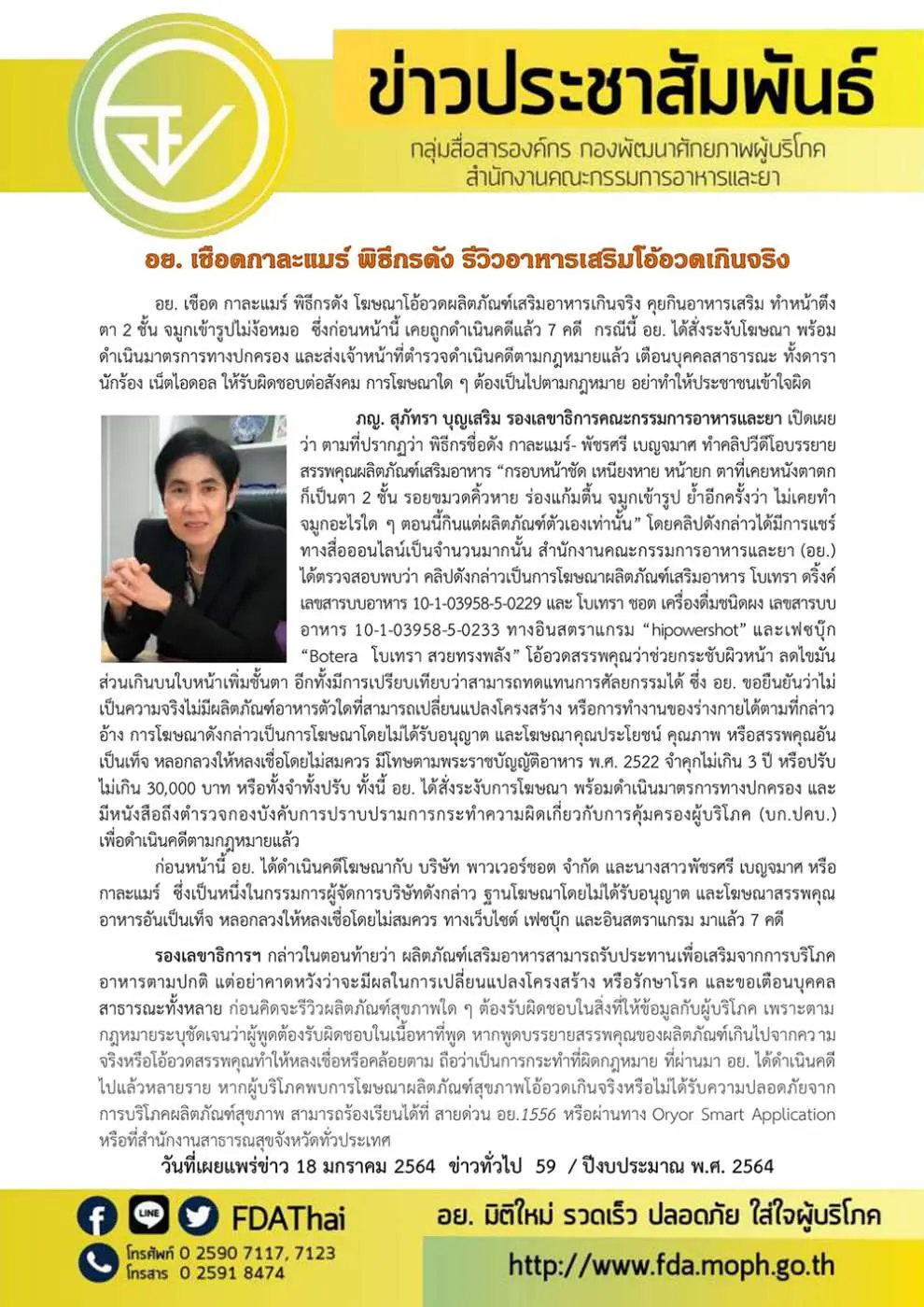 อย. เชือด กาละแมร์ พิธีกรดัง โฆษณาโอ้อวดผลิตภัณฑ์เสริมอาหารเกินจริง คุยกินอาหารเสริม ทำหน้าตึง ตา 2 ชั้น จมูกเข้ารูปไม่ง้อหมอ ซึ่งก่อนหน้านี้ เคยถูกดำเนินคดีแล้ว 7 คดี กรณีนี้ อย. ได้สั่งระงับโฆษณา พร้อมดำเนินมาตรการทางปกครองและส่งเจ้าหน้าที่ตำรวจดำเนินคดีตามกฎหมายแล้ว เตือนบุคคลสาธารณะทั้งดารา นักร้อง เน็ตไอดอล ให้รับผิดชอบต่อสังคม การโฆษณาใด ๆ ต้องเป็นไปตามกฎหมาย อย่าทำให้ประชาชนเข้าใจผิด