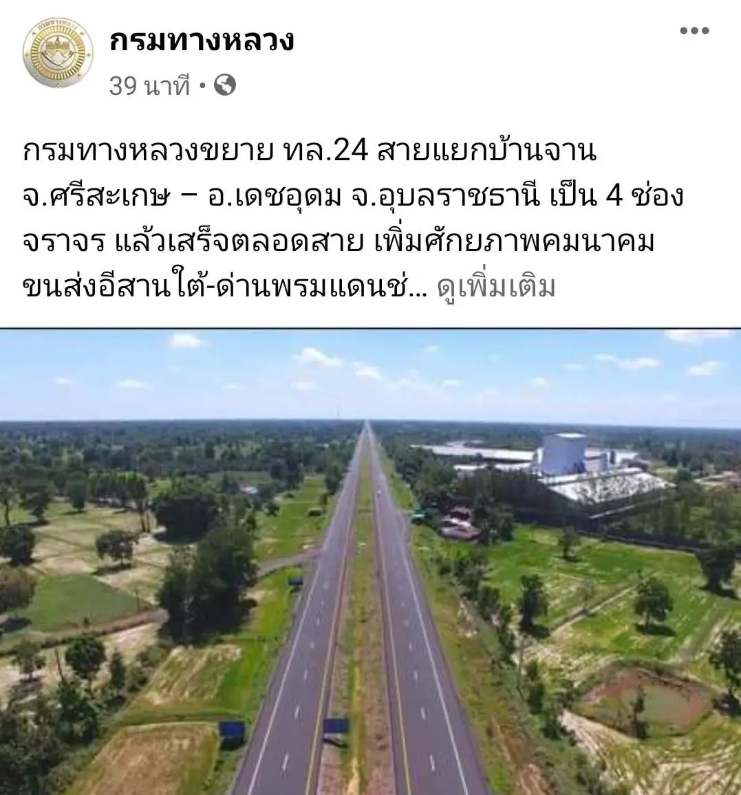 กรมทางหลวงขยาย ทล.24 สายแยกบ้านจาน จ.ศรีสะเกษ – อ.เดชอุดม จ.อุบลราชธานี เป็น 4 ช่องจราจร แล้วเสร็จตลอดสาย
