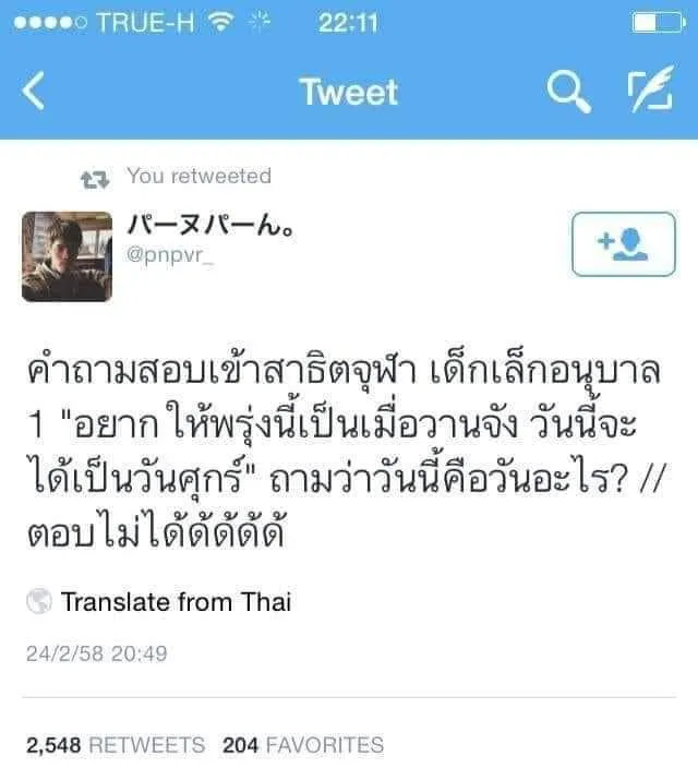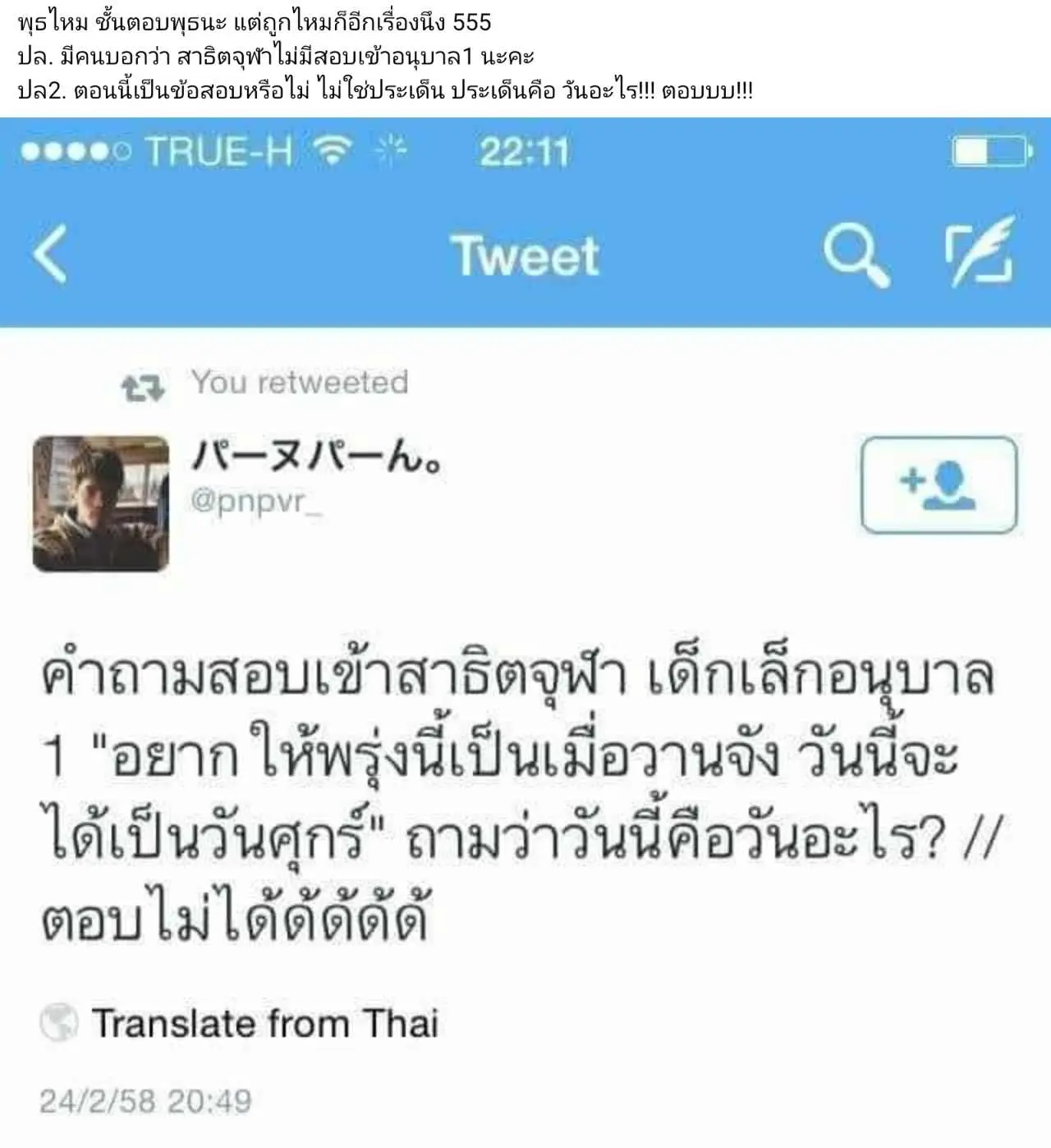 พุธไหม ชั้นตอบพุธนะ แต่ถูกไหมก็อีกเรื่องนึง 555 ปล. มีคนบอกว่า สาธิตจุฬาไม่มีสอบเข้าอนุบาล1 นะคะ ปล2. ตอนนี้เป็นข้อสอบหรือไม่ ไม่ใช่ประเด็น ประเด็นคือ วันอะไร!!! ตอบบบ!!!