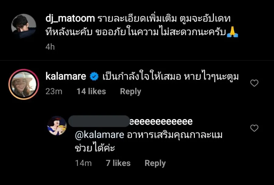หลังจากที่ ดีเจมะตูมได้ออกมาเผย ว่าตนนั้นติดโควิด ดาราเพื่อนๆในวงการต่างพาให้กำลังใจ รวมถึง กาละแมร์ ที่เพิ่งมีดราม่า เรื่องพูดขายอาหารเสริม เกินจริง ได้เข้ามาให้กำลังใจมะตูมด้วย แต่ไม่วาย โดนชาวเน็ต แซะ ให้กิน อาหารเสริมของ กาละแมร์ สิ เพราะ กาละแมร์ เคยพูดตอนไลฟ์สด ด้วยว่า ช่วยเรื่องโควิด19 ด้วย