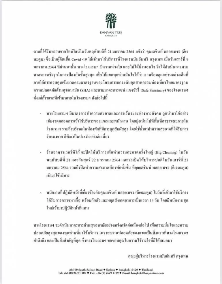 โรงแรมบันยันทรี ซึ่งเป็นโรงแรมระดับ 5 ดาว ตั้งอยู่บนถนนสาทรใต้ กรุงเทพมหานคร เปิดเผยว่าได้สั่งปิดร้านอาการเวอร์ทิโก้ ซึ่งอยู่บนชั้นที่ 61 ชั้นสูงสุด หลังจากดีเจมะตูม หรือ นายเตชินท์ พลอยเพชร เข้าไปใช้บริการเมื่อวันที่ 9 มกราคม 2564 ร้านอาหารเวอร์ทิโก้ปิดบริการเป็นเวลา 2 วัน เพื่อทำความสะอาด รวมถึงปิดทำความสะอาดห้องพักทั้งชั้นที่ดีเจมะตูมได้เข้าไปใช้บริการ