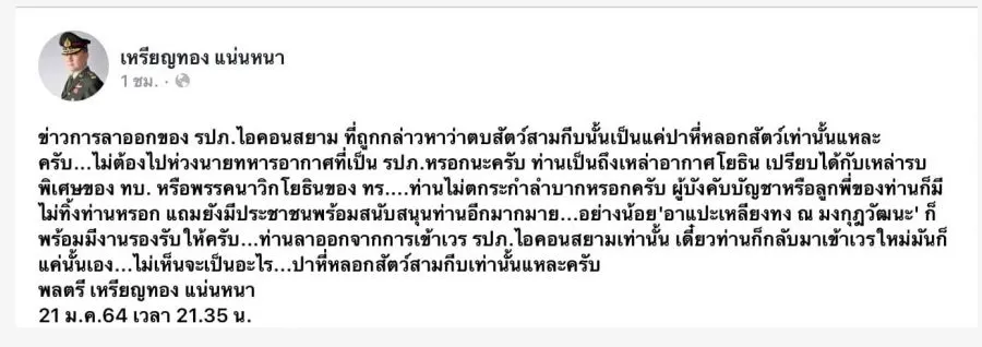 ล่าสุด พล.ต.นพ.เหรียญทอง แน่นหนา ผอ.รพ.มงกุฎวัฒนะ เผยว่า ข่าวการลาออกของ รปภ.ไอคอนสยาม ที่ถูกกล่าวหาว่าตบสัตว์สามกีบนั้นเป็นแค่ปา...่หลอกสัตว์เท่านั้นแหละครับ...ไม่ต้องไปห่วงนายทหารอากาศที่เป็น รปภ.หรอกนะครับ ท่านเป็นถึงเหล่าอากาศโยธิน เปรียบได้กับเหล่ารบพิเศษของ ทบ. หรือพรรคนาวิกโยธินของ ทร....ท่านไม่ตกระกำลำบากหรอกครับ ผู้บังคับบัญชาหรือลูกพี่ของท่านก็มี ไม่ทิ้งท่านหรอก แถมยังมีประชาชนพร้อมสนับสนุนท่านอีกมากมาย...อย่างน้อย'อาแปะเหลียงทง ณ มงกุฎวัฒนะ' ก็พร้อมมีงานรองรับให้ครับ...ท่านลาออกจากการเข้าเวร รปภ.ไอคอนสยามเท่านั้น เดี๋ยวท่านก็กลับมาเข้าเวรใหม่มันก็แค่นั้นเอง...ไม่เห็นจะเป็นอะไร...ปา...่หลอกสัตว์สามกีบเท่านั้นแหละครับ
