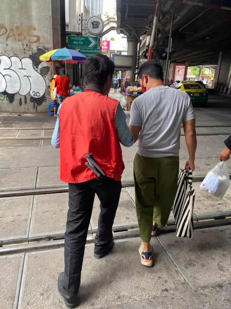 เรายื่นแขนให้น้องเกาะ พากันเดินไปตามฟุตบาท คอยบอกน้องเป็นระยะ