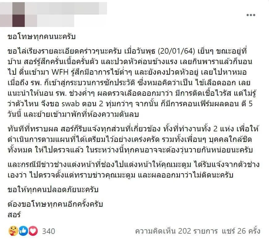 ขอไล่เรียงรายละเอียดคร่าวๆนะครับ เมื่อวันพุธ (20/01/64) เย็นๆ ขณะอยู่ที่บ้าน สอร์รู้สึกครั่นเนื้อครั่นตัว และปวดหัวค่อนข้างแรง เลยกินพาราแล้วก็นอนไป ตื่นเข้ามา WFH รู้สึกมีอาการไข้ต่ำๆ และยังคงปวดหัวอยู่ เลยไปหาหมอ เมื่อถึง รพ. ก็เข้าสู่กระบวนการซักประวัติ ซึ่งหมอคิดว่าเป็น ไข้เลือดออก เลยแนะนำให้นอน รพ. ช่วงค่ำๆ ผลตรวจเลือดออกมาว่า มีการติดเชื้อไวรัส แต่ไม่รู้ว่าตัวไหน จึงขอ swab ตอน 2 ทุ่มกว่าๆ จากนั้น ก็มีการคอนเฟิร์มผลตอน ตี 5 วันนี้ และย้ายเข้ามาพักที่ห้องความดันลบ
