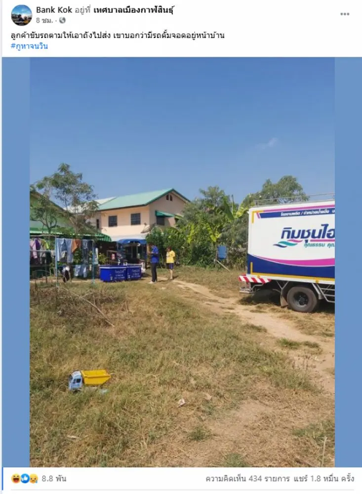เป็นอีกหนึ่งเรื่องราวที่ชาวเน็ตต่างให้ความสนใจกันเป็นจำนวนมาก หลังมีผู้ใช้เฟสบุ๊คชื่อ Bank Kok ได้ออกมาโพสต์เรื่องราวผ่านเฟสบุ๊คส่วนตัวหลังไปส่งถังในหมู่บ้านพร้อมทั้งได้ระบุข้อความว่า ลูกค้าขับรถตามให้เอาถังไปส่ง เขาบอกว่ามีรถดั้มจอดอยู่หน้าบ้าน หาจนวิน