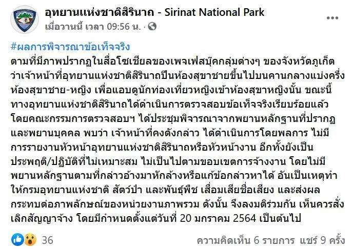 ตามที่มีภาพปรากฏในสื่อโซเชียลของเพจเฟสบุ๊คกลุ่มต่างๆ ของจังหวัดภูเก็ต ว่าเจ้าหน้าที่อุทยานแห่งชาติสิรินาถปีนห้องสุขาชายขึ้นไปบนคานกลางแบ่งครึ่งห้องสุขาชาย-หญิง เพื่อแอบดูนักท่องเที่ยวหญิงเข้าห้องสุขาหญิงนั้น ขณะนี้ทางอุทยานแห่งชาติสิรินาถได้ดำเนินการตรวจสอบข้อเท็จจริงเรียบร้อยแล้ว โดยคณะกรรมการตรวจสอบฯ ได้ประชุมพิจารณาจากพยานหลักฐานที่ปรากฏและพยานบุคคล พบว่า เจ้าหน้าที่คงดังกล่าว ได้ดำเนินการโดยพลการ ไม่มีการรายงานหัวหน้าอุทยานแห่งชาติสิรินาถหรือหัวหน้างาน อีกทั้งยังเป็นประพฤติ/ปฏิบัติที่ไม่เหมาะสม ไม่เป็นไปตามขอบเขตการจ้างงาน โดยไม่มีพยานหลักฐานตามที่กล่าวอ้างมาหักล้างหรือแก้ข้อกล่าวหาได้ อันเป็นเหตุทำให้กรมอุทยานแห่งชาติ สัตว์ป่า และพันธุ์พืช เสื่อมเสียชื่อเสียง และส่งผลกระทบต่อภาพลักษณ์ของหน่วยงานภาพรวม ดังนั้น จึงลงมติร่วมกัน เห็นควรสั่งเลิกสัญญาจ้าง โดยมีกำหนดตั้งแต่วันที่ 20 มกราคม 2564 เป็นต้นไป