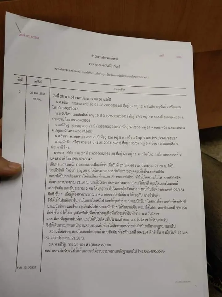 ต้องเป็นคนเ...้ยขนาดไหนอ่ะพวกกูไม่ได้ไปทำไรให้พวกมึงกันเลย บุกเข้ามาพังคอนโดกูทำร้ายพี่กูปางตายเสร็จมาทำกูต่อต้องเป็นคนเ...้ยขนาดไหน จะมาขู่ฆ่ากู พวกกูอยู่กัน4-5คน แต่พวกมึงยกพวกมากัน8-9คน อาวุธคบมือทั้งมีดทั้งปืนทั้งขวดเบียร์ ใครที่รู้จักบ้านมันหรือเห็นมันอยู่ระแวง คลอง 3-4-5 หรือแถวพระอินทร์ หรือที่ไหนให้รีบติดต่อมาทางเบอร์0838908501 หรือใครเป็นพวกเพื่อนมันให้บอกมันมามอบตัวซะ ยังมีอีกหลายคนแต่ยังหารูปกับเฟสไม่เจอ คดีนี้จะไม่จบง่ายๆ ถ้าพวกมึงยังไม่ติดคุก