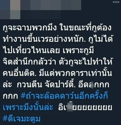 กูจะฉาบพวกมึง ในขณะที่กูต้องทำงานขึ้นเวรอย่างหนัก. กูไม่ได้ไปเที่ยวไหนเลย เพราะกูมีจิตสำนึกกลัวว่า ตัวกูจะไปทำให้คนอื่นติด. มีแต่พวกดาราเท่านั้นล่ะ กวนตีน จัดปาร์ตี้. ...กกกกก #ถ้าจะล๊อคดาว์นอีกครั้งก็เพราะมึงนั้นล่ะ อิเ...้ยยยยยยยย #ดีเจมะตูม