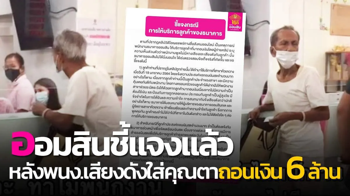 จากกรณีโลกโซเชียลพูดถึงคลิปเหตุการณ์ ขณะชายสูงอายุคนหนึ่ง เข้ามาขอถอนเงิน 6 ล้านบาทในบัญชี แต่กลับถูกพนักงานแบงก์ พูดจาเสียงดังใส่ ด้วยน้ำเสียงที่ไม่สุภาพ จนกลายเป็นกระแสวิพา กษ์วิจา รณ์ ล่าสุด ธนาคารได้ตรวจสอบข้อเท็จจริงที่เกิดขึ้นและขอชี้แจงว่า ลูกค้าในคลิปเข้ามาใช้บริการสาขาห้วยขวางวันที่ 19 ม.ค.ที่ผ่านมา