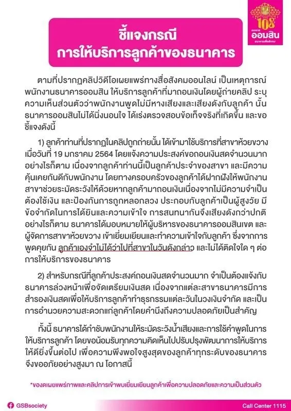 ประกอบกับลูกค้าเป็นผู้สูงวัย มีข้อจำกัดเรื่องการได้ยินและความเข้าใจ การสนทนาจึงเสียงดังกว่าปกติ โดยธนาคารได้มอบหมายให้ผู้บริหารธนาคารออมสินเขตและผู้จัดการสาขา เข้าเยี่ยมและทำความเข้าใจกับลูกค้า จากการพูดคุยลูกค้าไม่ได้ติดใจใดๆ ต่อการบริการ