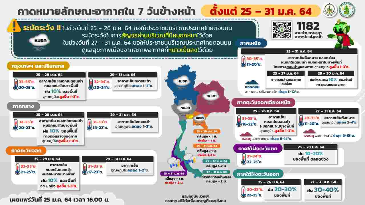 สำหรับยอดดอยและยอดภู มีอากาศหนาวถึงหนาวจัด ขอให้ประชาชนบริเวณประเทศไทยตอนบน ระวังอันตรายจากการสัญจร ผ่านบริเวณที่มีหมอกหนา ส่วนบริเวณภาคกลางตอนล่าง ภาคตะวันออก รวมทั้งกรุงเทพและปริมณฑล มีฝนบางแห่ง