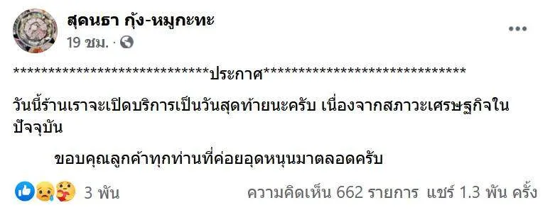 เพจเฟสบุ๊ค สุคนธา กุ้ง-หมูกะทะ ได้ออกมาโพสต์ ประกาศ ปิดตัวลงอย่างเป็นทางการ หลังทนพิษโควิดไม่ไหว โดยระบุว่า..